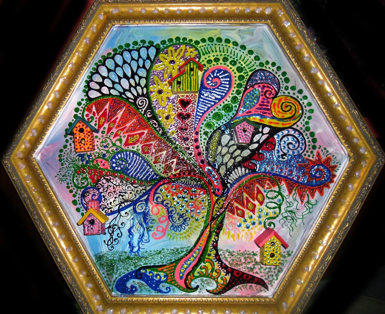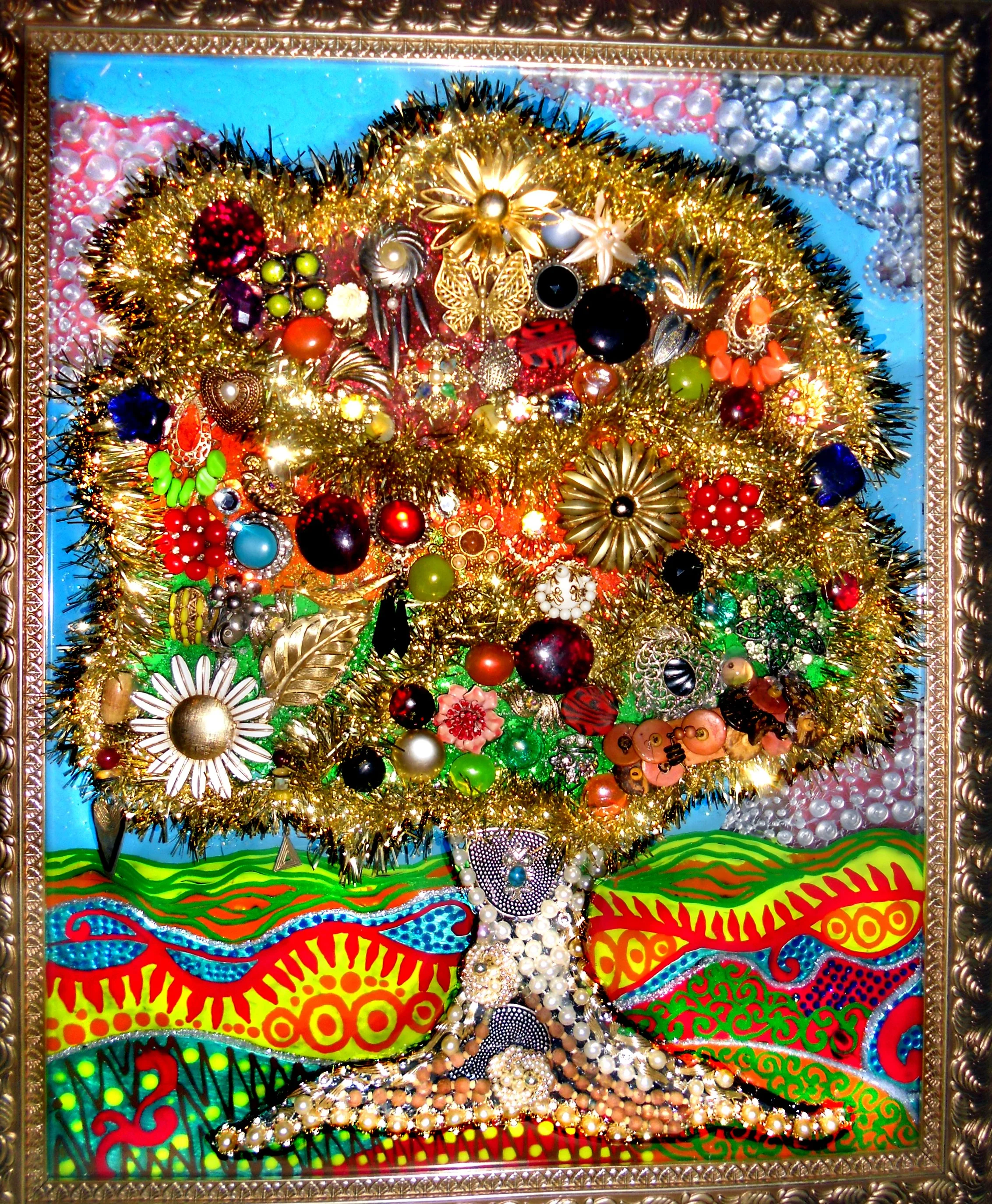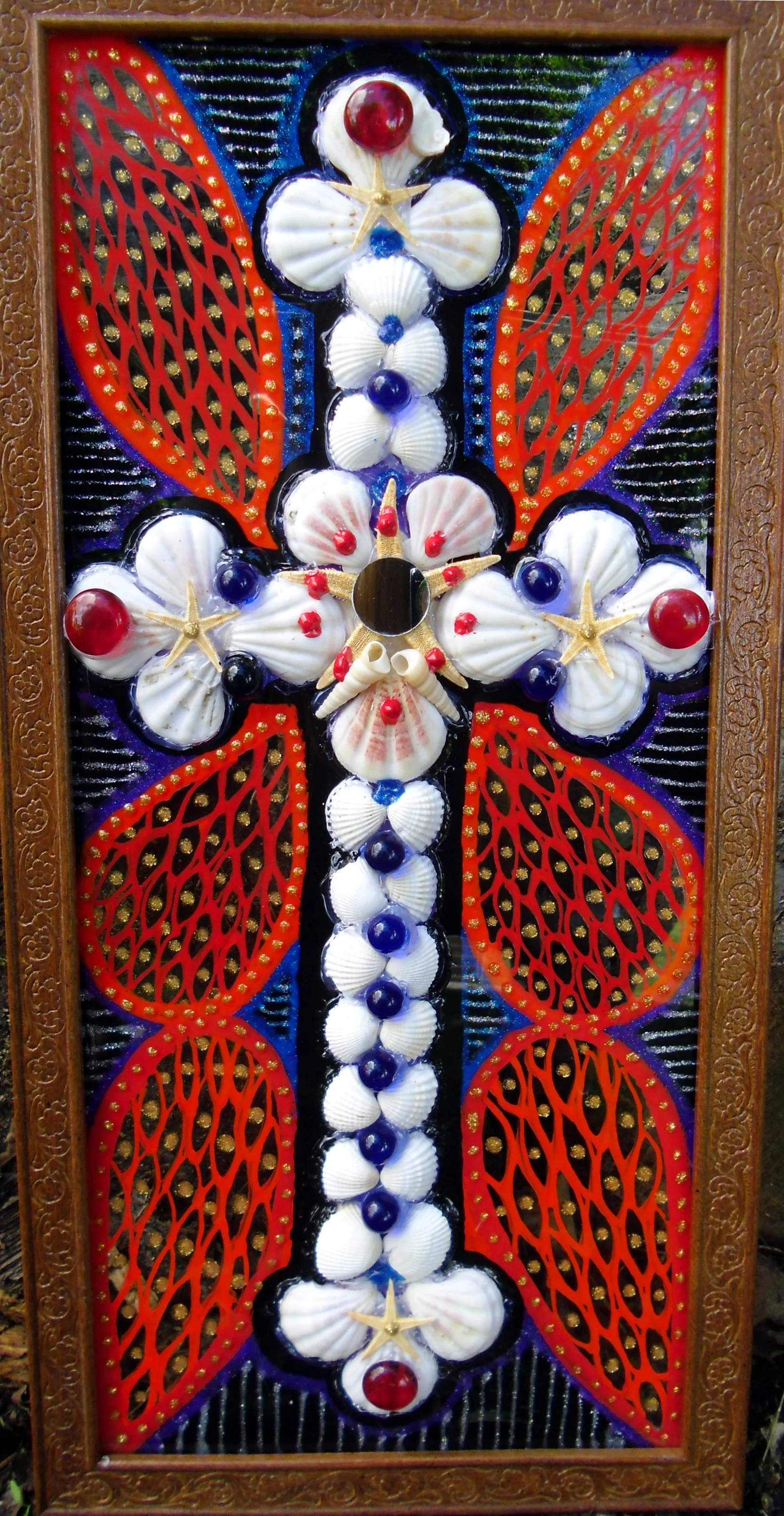 These works incorporate much of my glass painting-technique, but the focal point of these pieces are the mosaic elements. With these paintings I use a variety of objects and materials such as seashells, broken jewelry, beads, feathers, marbles, and mirrors just to name a few. Taking random objects and using them to see a bigger picture is an exciting process; it is like building a puzzle but being the one to choose where the boundaries are.